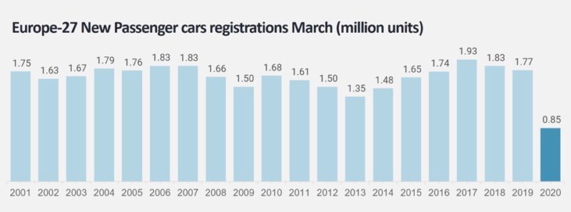 Passenger car registrations for Europe-27 down 52 per cent year-on-year